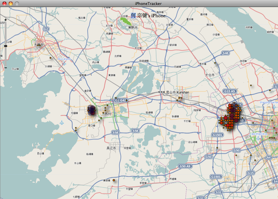 下了个iPhone的iPhone Tracker.app,运行一下,还真能读出我的手机的位置。如下图。