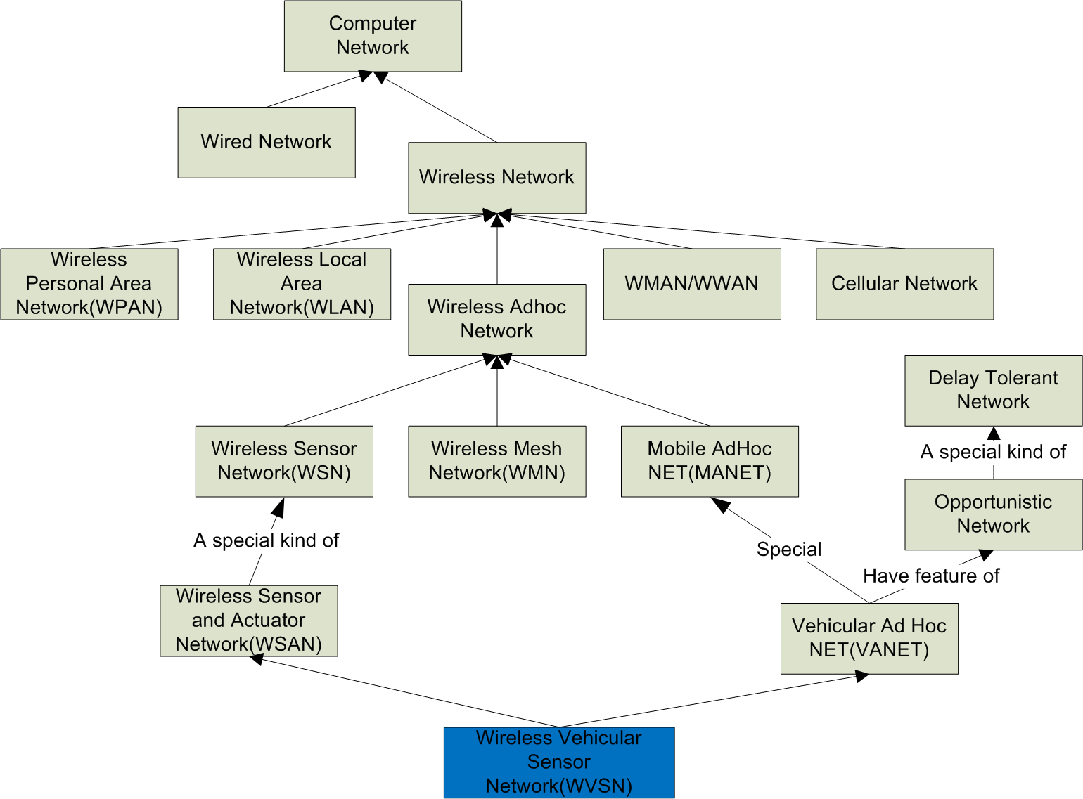 我的工作呢,大概就在蓝色的方框里。这个词是我自己发明的,叫Wireless Vehicular Sensor Network。就是WSN和车载系统的结合。或者叫WSN在车载环境下的应用(跟导师讨论过,导师说environment是个很奇怪的名字,不要随便用)?